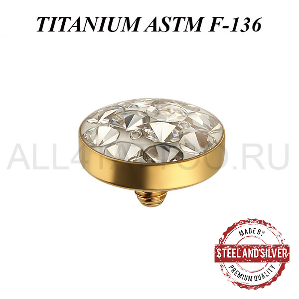 Накрутка из имплантационного титана ASTM F-136 с золотым 24х каратным PVD покрытием. украшена прозрачными Premium Crystals. Резьба накруток 1,2мм подходят к микродермалам и украшениям толщиной 1,6мм с внутренней резьбой.