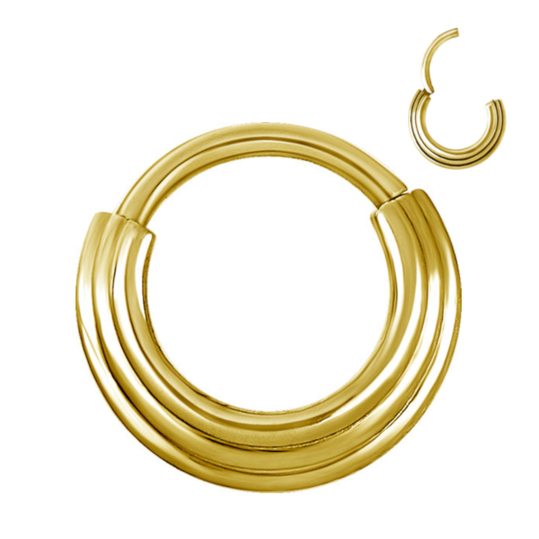 Кликер в виде тройного кольца из хирургической стали 316L  с 24х каратным золотым PVD покрытием.