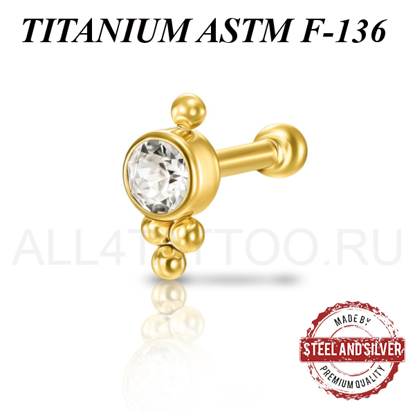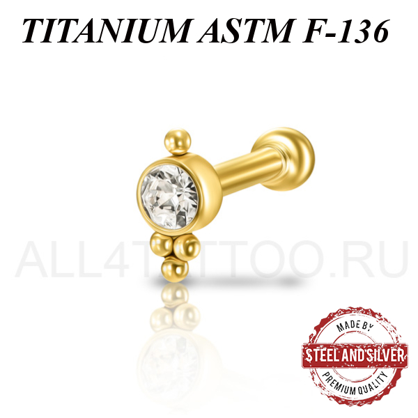 Микроштанга из имплантационного титана 6Al-4V-Eli ASTM: F-136 с 24х каратным золотым PVD покрытием, внутренняя резьба. Украшена кристаллом Swarovski диаметром 3 и 4мм.
