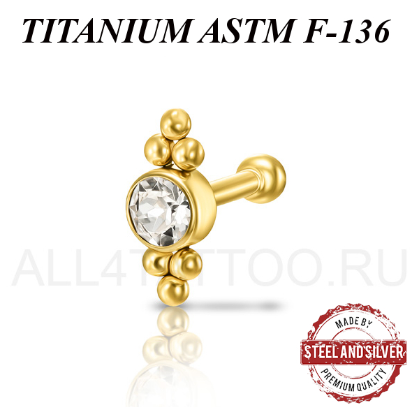 Микроштанга из имплантационного титана 6Al-4V-Eli ASTM: F-136 с 24х каратным золотым PVD покрытием, внутренняя резьба. Украшена кристаллом Swarovski диаметром 3 и 4мм.