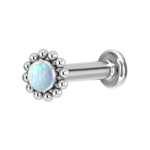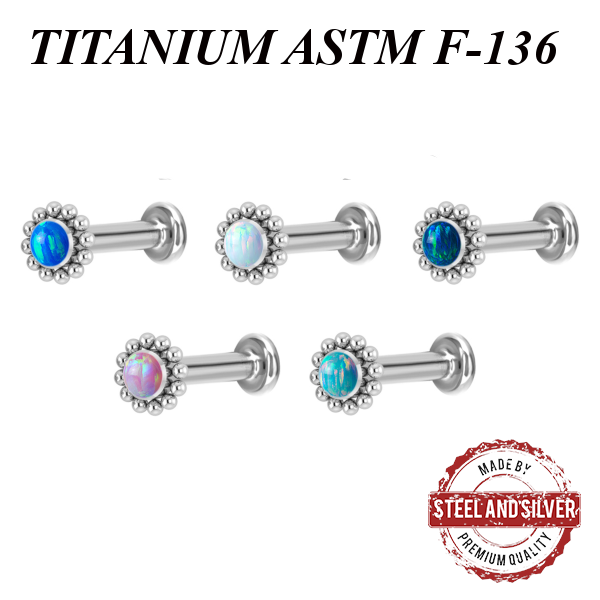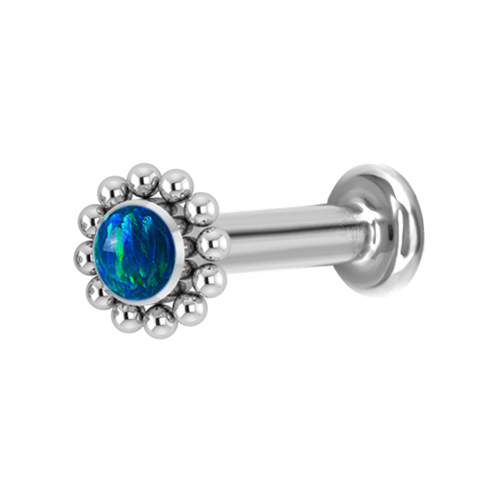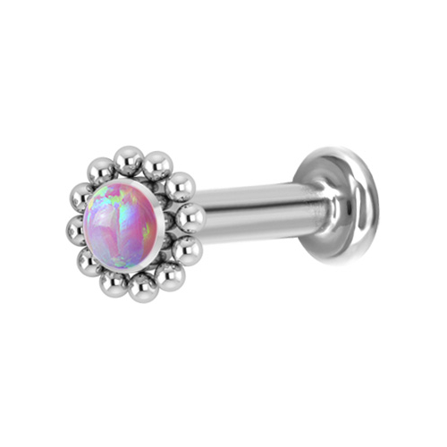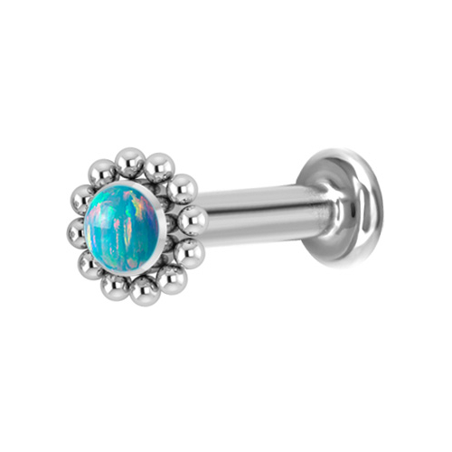 Лабрет из имплантационного титана 6Al-4V-Eli ASTM: F-136 с внутренней резьбой. Украшен искусственным опалом диаметром 3 мм.