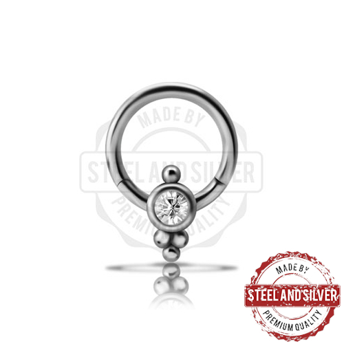 Кликер из хирургической стали 316L украшен кластером с кристаллом Swarovski. Обратная сторона кластера для гладкости покрыта эпоксидной смолой белого цвета, кликер идеален для прокола "Smile".