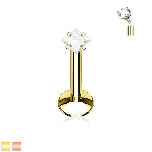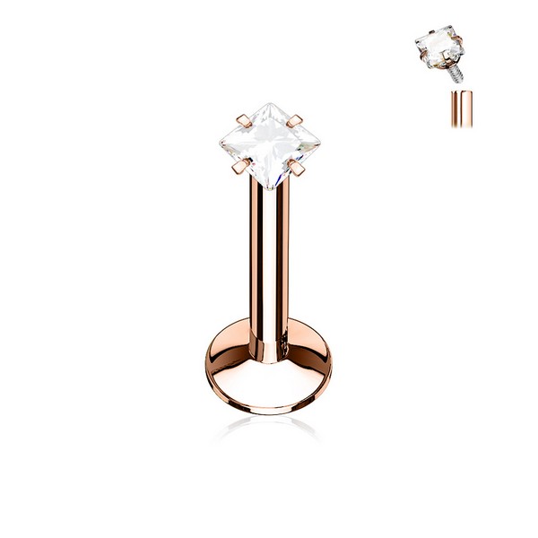 Лабрет из хирургической стали 316L с PVD покрытием жёлтого и розового золота украшен стразом. Внутренняя резьба.