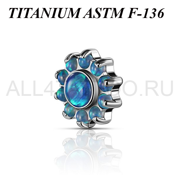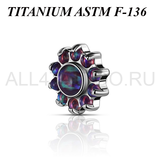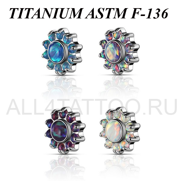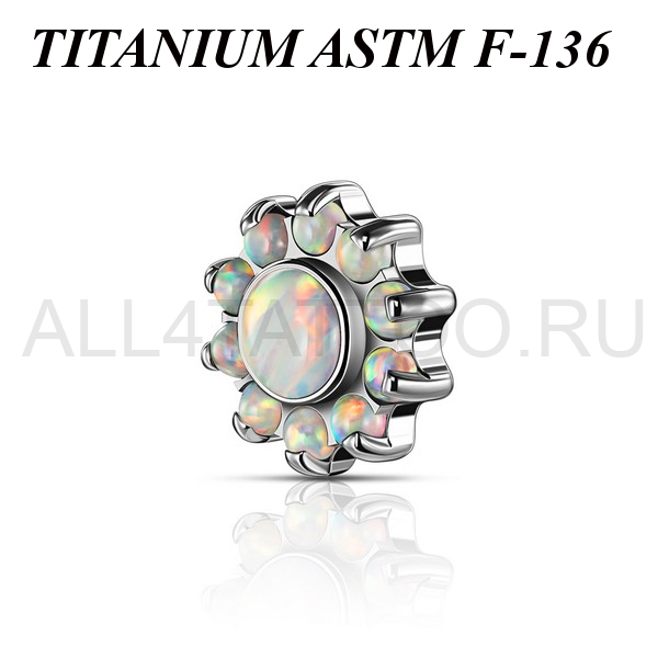 Накрутка из имплантационного титана 6Al-4V-Eli ASTM: F-136 в форме цветка, украшенного лабораторными опалами. Диаметр накрутки: 4,75мм. Подходит для украшений с внутренней резьбой толщиной 1,6 мм.
