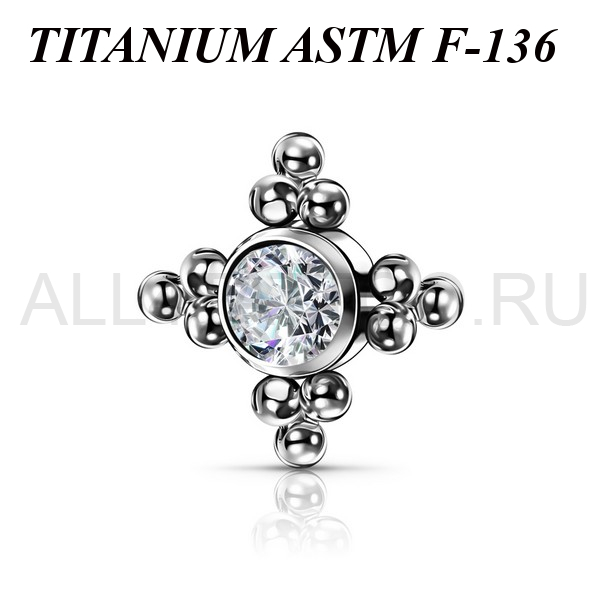 Кластер из имплантационного титана 6Al-4V-Eli ASTM: F-136 с фианитом диаметром 4мм. Подходит для украшений с внутренней резьбой толщиной 1,6 мм.