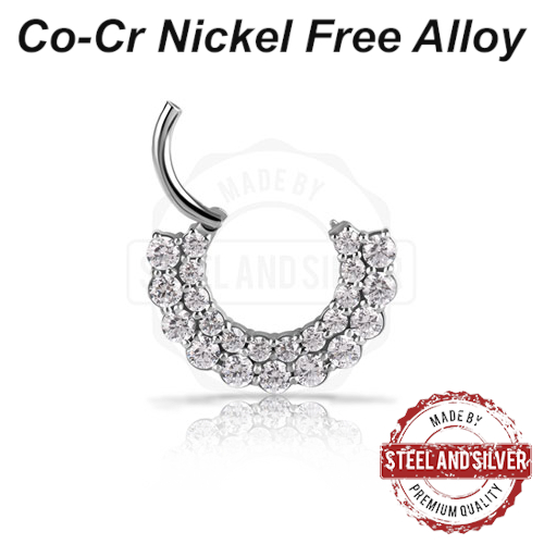 Кликер из сплава кобальт-хрома, без содержания никеля. Украшен двойным рядом прозрачных кристаллов Premium Cubic Zirconia. Представлен так же в варианте с 18-каратным золотым PVD покрытием.