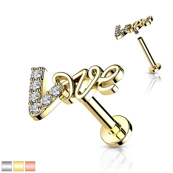 Лабрет из хирургической стали 316L с внутренней резьбой. Представлен в трёх вариантах: классический стальной и с PVD покрытием жёлтого и розового золота. Накрутка из родированной латуни, украшена фианитами. Размер накрутки: 9x5мм.