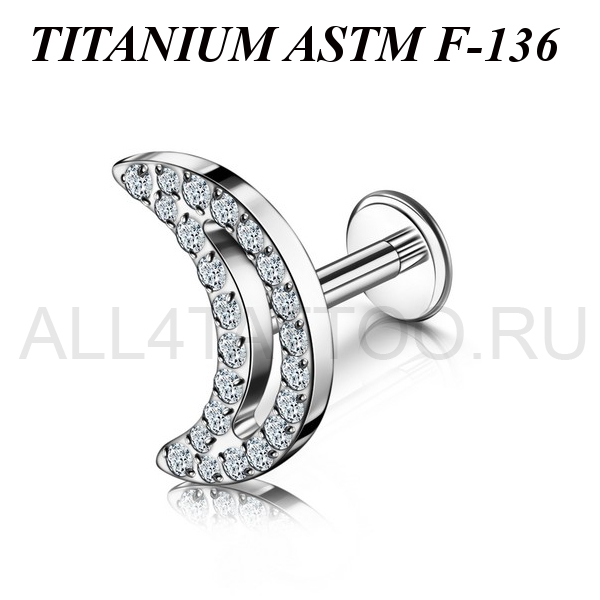 Лабрет из имплантационного титана 6Al-4V-Eli ASTM: F-136 с внутренней резьбой и накруткой в форме полумесяца, украшенного множеством прозрачных фианитов. Размер декоративной части: 7х10мм.