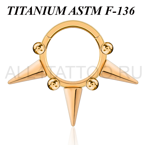 Кликер из имплантационного титана 6Al-4V-Eli ASTM: F-136 с золотым PVD покрытием. Украшен тремя шипами длиной 6мм, чередующимися с миниатюрными шариками.