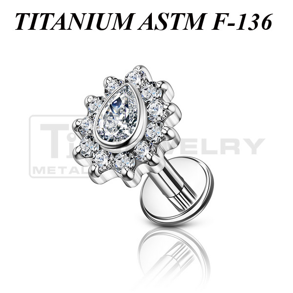Лабрет с внутренней резьбой из имплантационного титана 6Al-4V-Eli ASTM: F-136. Украшен кластером с прозрачными фианитами. Размер кластера: 5,6х6,3мм.