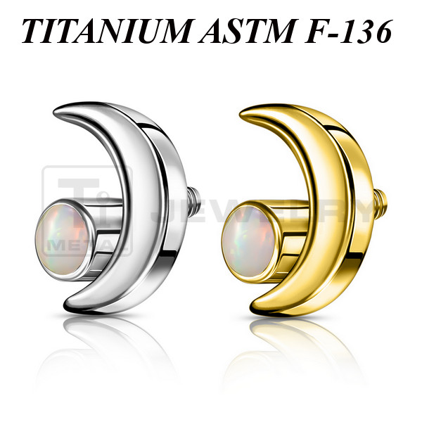Накрутка из имплантационного титана 6Al-4V-Eli ASTM: F-136. Представлена в двух вариантах: классическая титановая и с золотым PVD покрытием. Выполнена в форме полумесяца, украшенного синтетическим опалом. Размер накрутки: 6х4мм. Подходит для украшений с внутренней резьбой толщиной 1 и 1,2мм.