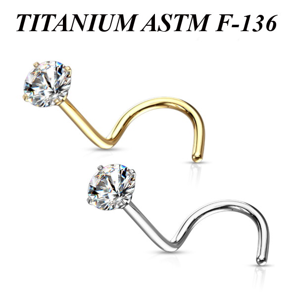 Нострил из имплантационного титана 6Al-4V-Eli ASTM: F-136, украшен круглым фианитом. Представлен в двух вариантах: классический титановый и с золотым PVD покрытием.