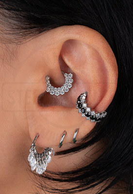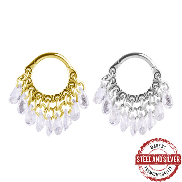 Кликер из хирургической стали 316L. Представлен в двух вариантах: классический стальной и с золотым 24х каратным PVD покрытием. Украшен кристаллами Cubic Zirconia