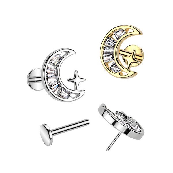 Безрезьбовой лабрет из хирургической стали 316L с декоративной частью из родированной латуни. Украшен фианитами. Представлен в двух вариантах: классический стальной и с золотым PVD покрытием. Размер декоративной части: 7,4х9мм.